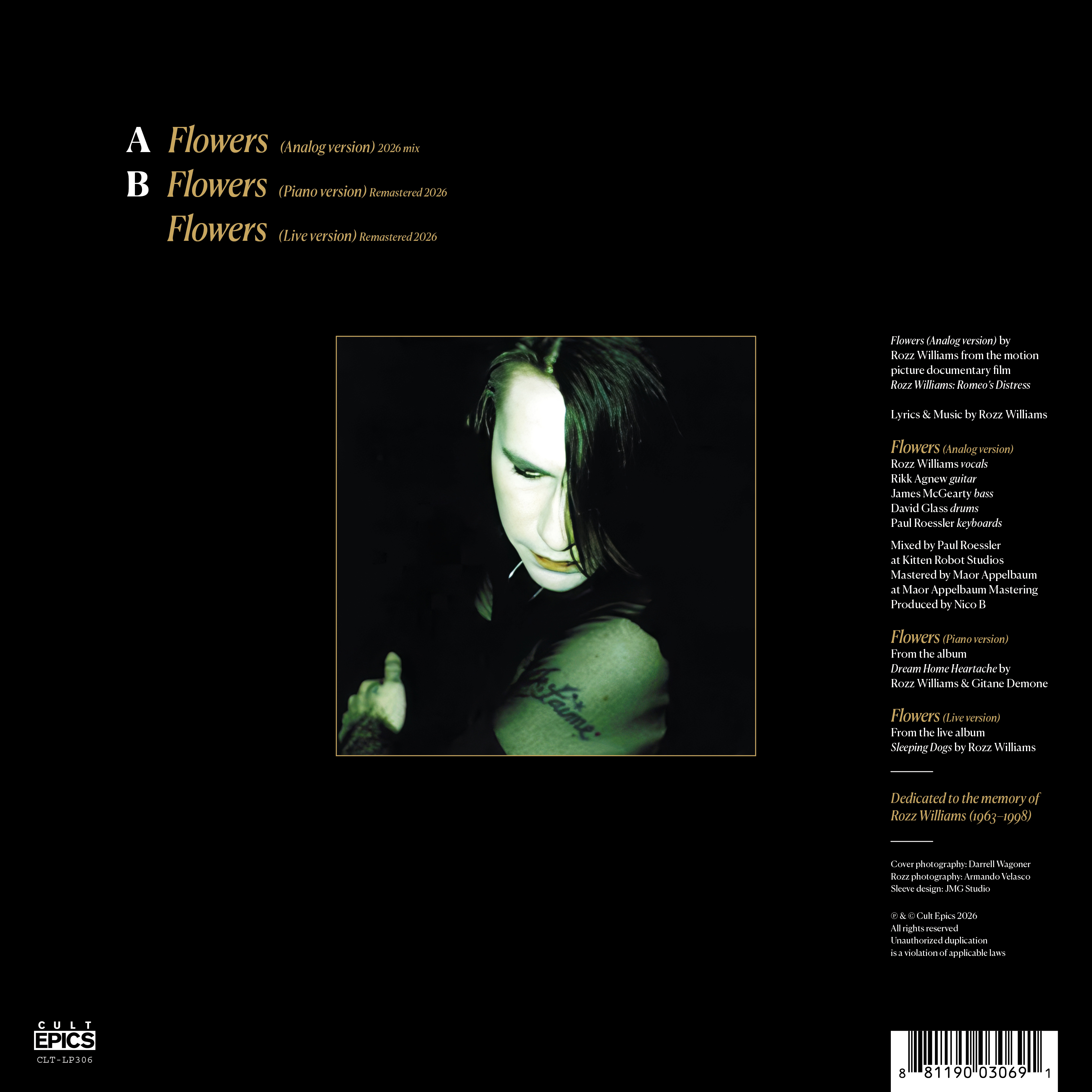 New music track recording of Flowers (2026 mix) by former members of Christian Death: Rikk Agnew (guitar), James McGearty (bass), David Glass (drums), and Paul Roessler (45 Grave) on keyboard, featuring Rozz Williams on vocals. Soundtrack for the new documentary film Rozz Williams: Romeo’s Distress by Nico B - in theaters across the Globe.